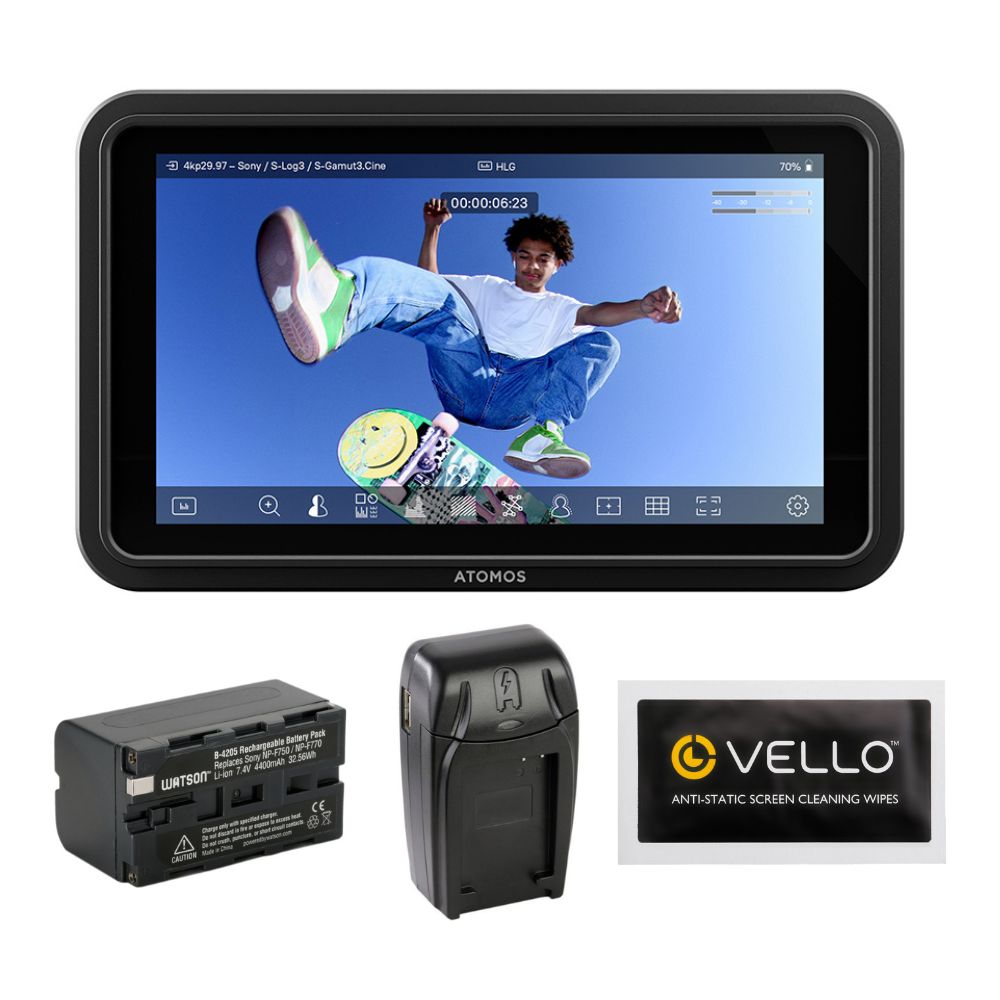 Atomos Shinobi GO 5” HDR Touchscreen Monitor 1500-Nit Bundle with Watson NP-F770 Lithium-Ion Battery Pack, Watson Compact Charger for L & M Series Batteries, Anti-Static Screen Cleaning Wipes (5-Pack)