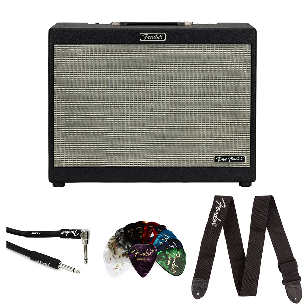 Fender Tone Master FR-10 1,000-watt 1 x 10-inch Powered Guitar Cabinet Bundle with Classic Celluloid Guitar Picks 351 Shape 12-Pack, 10' Instrument Cable Black, Guitar Strap Black with White Logo