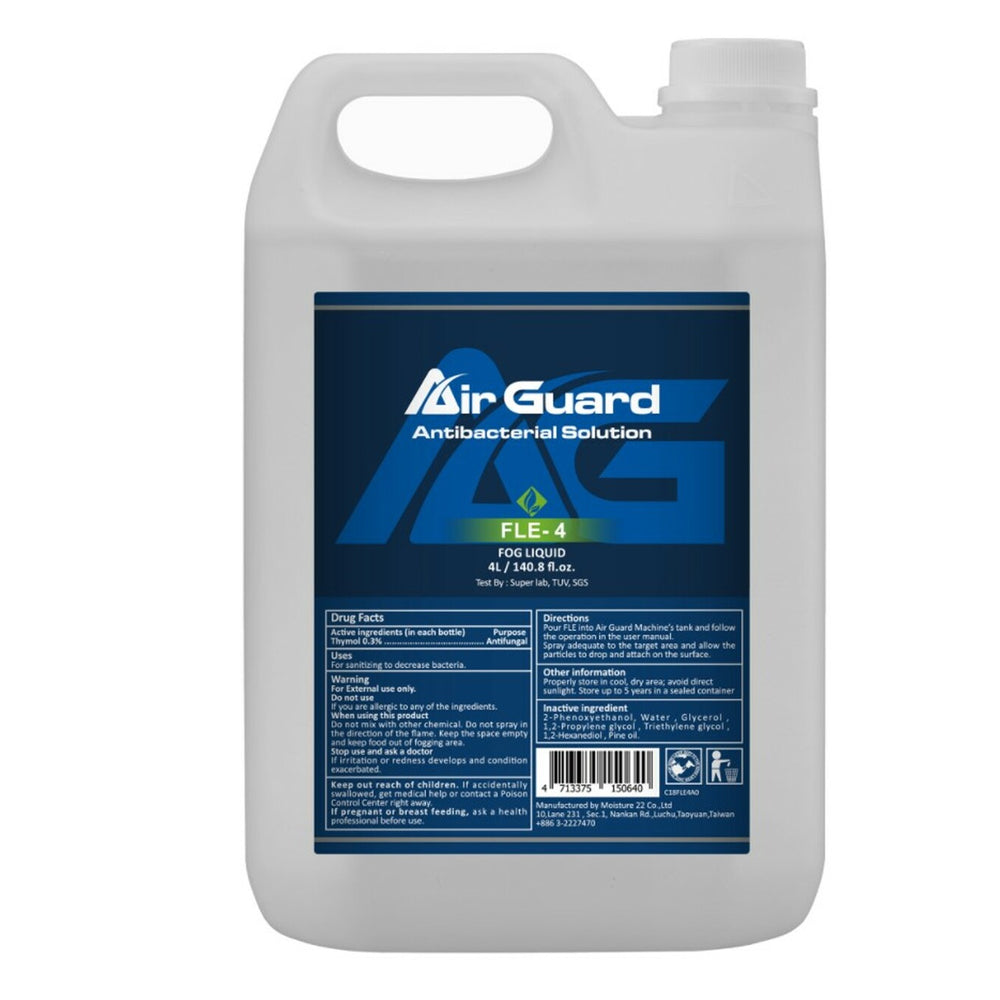 4 liter bottle of disinfection fluid for use with Antari Air Guard Disinfection Fog Machines. The active ingredient in FLE4 Disinfection Fluid is Umbelliferol, an effective antibacterial agent with the ability to kill a variety of bacteria, yeast, fungi and viruses. It can also inhibit oxidation. FDA Registered. The FLE4 disinfectant works by denaturing the virus' proteins, which makes it incapable of binding to human cells. It is effective against the influenza virus and general pneumonia. It has not been tested against the COVID-19 virus, as it is highly regulated by the government and no samples are available to test. How long the effect lasts depends on the environmental conditions, such as ventilation and number of human movements. For example, disinfection in a car for personal use can be effective for 2 weeks, however, a car used frequently for business should be disinfected each day. In general, the more occupied a location is, the more frequently it should be disinfected. FLE4 is safe for use by humans, but always follow safety guidelines and directions. It has a shelf life of 5 years and should be stored in a cool area out of direct sunlight. Once opened, it should be used within 6 months.